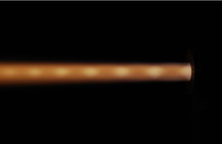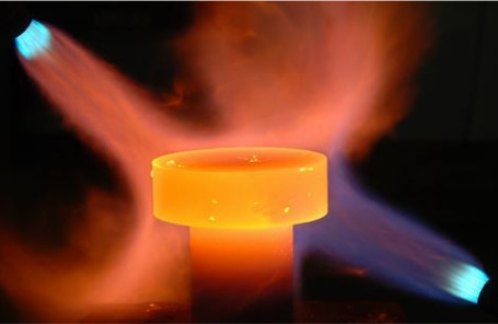 セラミック溶射は通常4種類の溶射法のうち、当社は溶線式フレーム溶射(ローカイド)方式を採用しています。この溶射法は、棒状に加工したセラミックロッドを燃焼ガスにより、溶融された粒子のみ基材に吹き付け、高密度、高密着の皮膜を形成します。